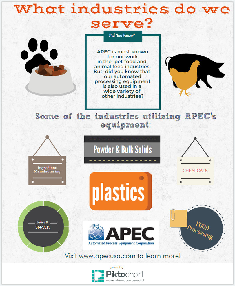 在我们23年的业务过程中,我们已经帮助设计,制造,安装和维护了宠物食品,动物饲料和食品加工行业的客户的自动化加工设备 - 但这只是冰山一角。让我们仔细看看利用APEC加工设备的许多行业。